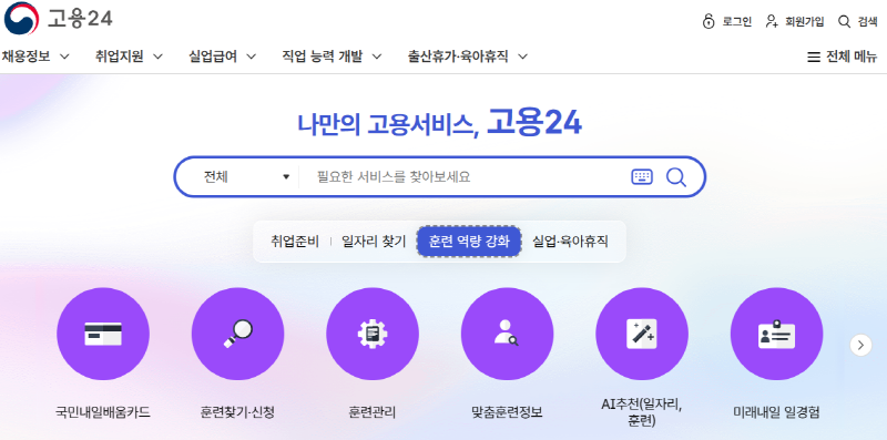 고용24 온라인사이트 접속 후 검색란 밑 목록에서 훈련역량강화 -> 국민내일배움카드 신청